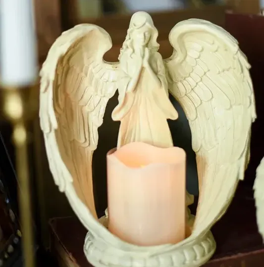 👼Multi-functional Electronic Candle Holder: Angel image praying with a flameless, battery-operated candle. Designed to be lit with batteries and a flickering flame, you can take it apart and put a real candle in if you wish.