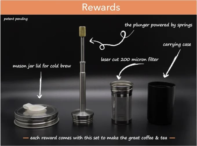 Each reward comes with our customized stainless steel jar lid that fits to any regular mouth mason jar that is probably already in your kitchen. Instead of hot water, add cold water in the jar. Place Press coffee filter in the jar, close our customized lid and leave it in the fridge over night. Our system works by brewing coffee grounds in cold water. The stainless steel micron filter creates and preserves perfectly balanced, smooth tasting flavors every time by leaving behind the bitter oil and fatty acids.