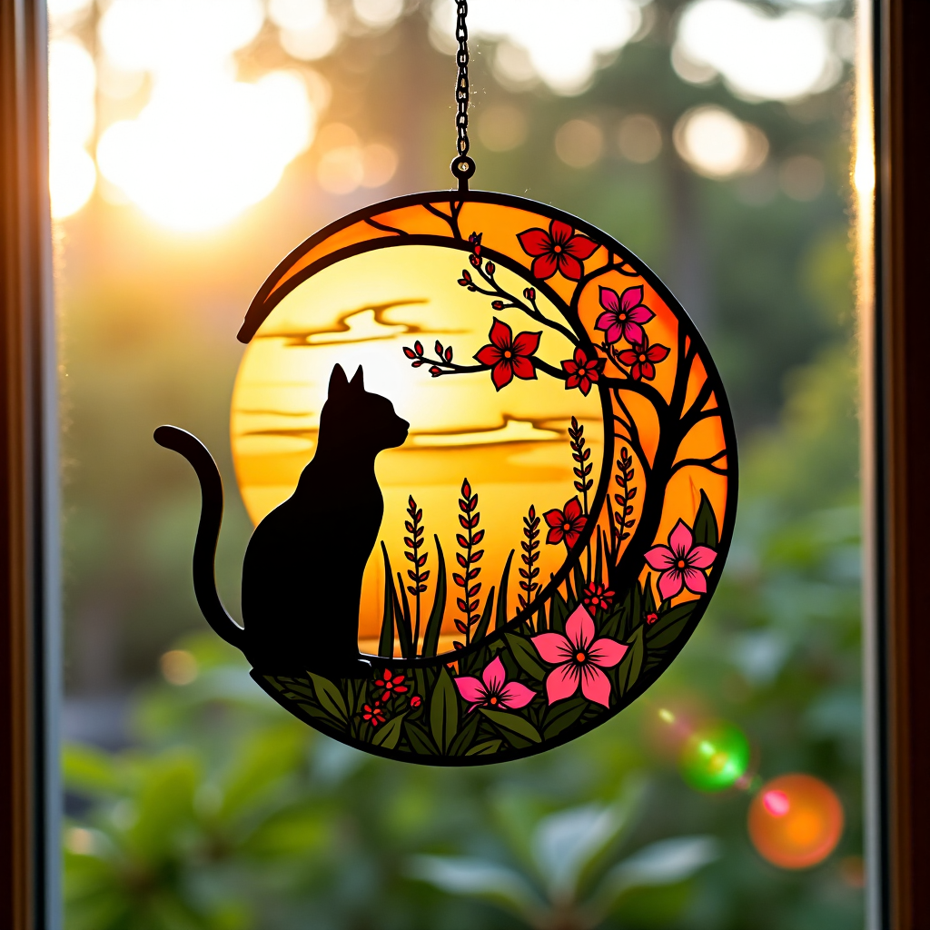 🌙🐈‍⬛ Black Cat & Floral Stained Glass-Style Window Hanging