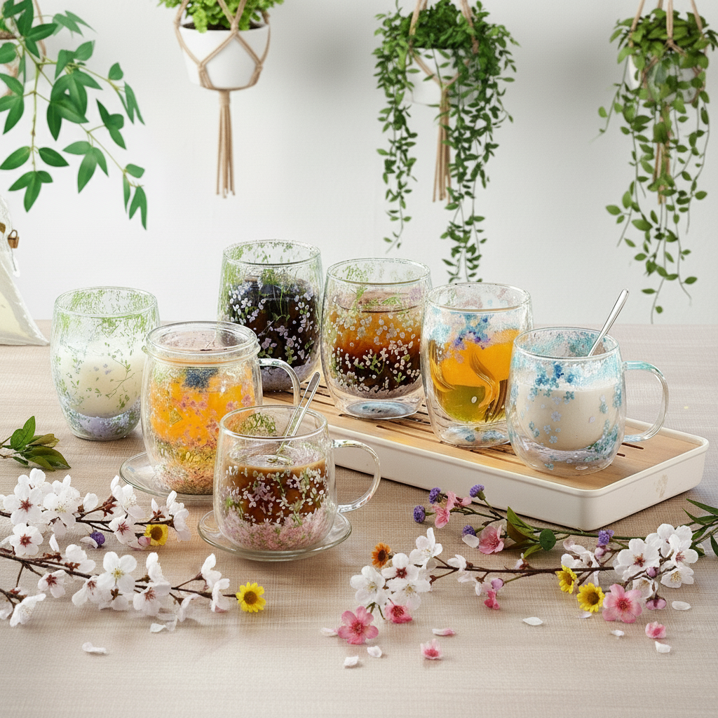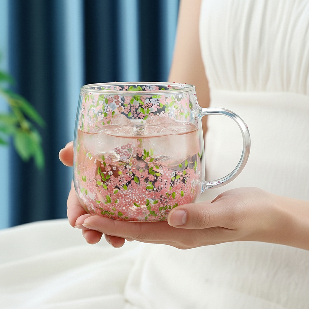 Add a touch of magic to your daily routine with this stunning double-wall transparent tumbler! Featuring floating glitter flakes with delicate flower and leaf designs, each cup creates a mesmerizing display when filled with your favorite beverage.