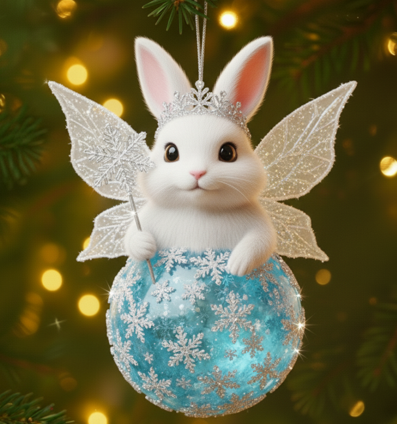 • Fairy Bunny: A fluffy white rabbit dons a silver snowflake crown and iridescent wings, holding a snowflake wand atop a blue, snow - dusted bauble—ideal for lovers of cute and cozy charm.