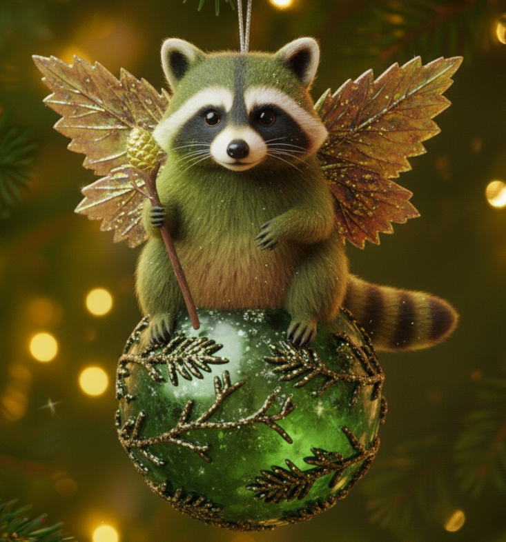 • Forest Raccoon Fairy: A green raccoon sports golden leaf - shaped wings and a pinecone scepter, perched on a green, evergreen - detailed bauble—great for those who adore woodland whimsy.