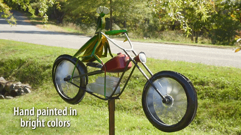 The spokes of his enormous front wheel will spin in the breeze and cause his legs to move up and down in a peddling motion.