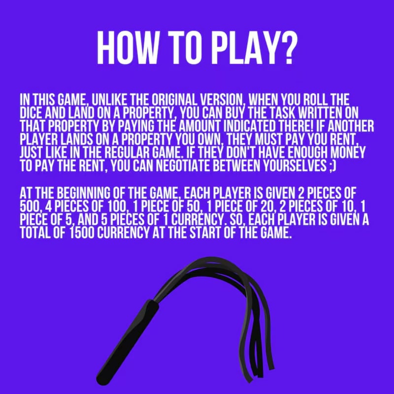 Differing from the typical game, in this one, you purchase the task where the dice lands. When you buy a task, your partner must complete it. If your partner lands on the area you've purchased in the next game, they have to pay you the rent amount for that area. This way, you can accumulate more money and buy more tasks ;)