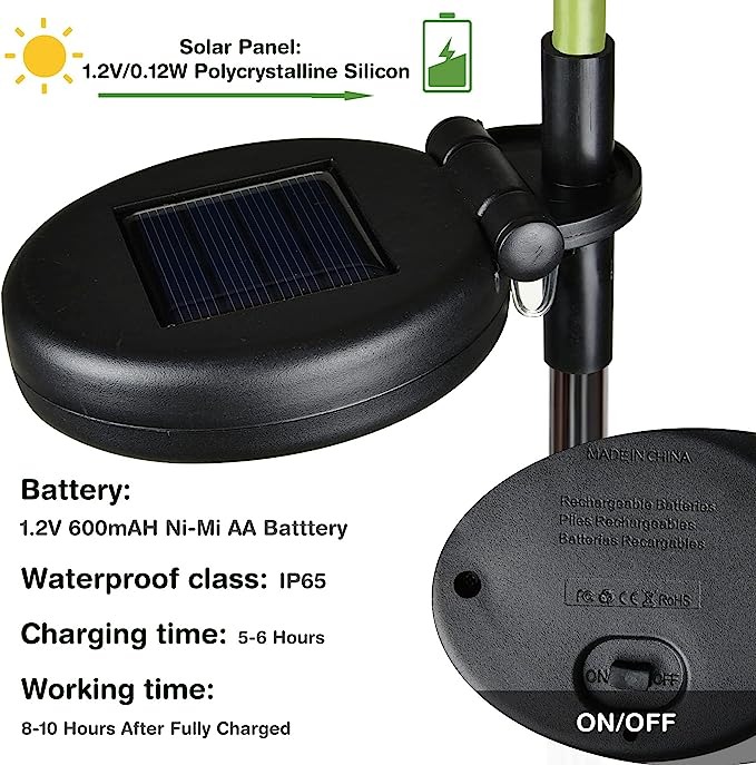 【SOLAR AUTOMATIC CHARGING】: The solar Garden Lights panels are automatically charged during the day and the lights are automatically turned on at night. Charging for 5-6 hours, working time 8-10 hours.